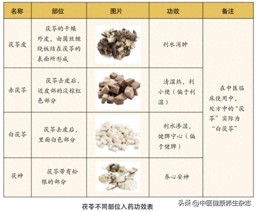 茯苓按照由外至內的入藥部位,可分爲茯苓皮、赤茯苓、白茯苓、茯神,利水消腫作用依次減弱,寧心安神功效逐漸增強,應在辨證施治原則下正確選用。