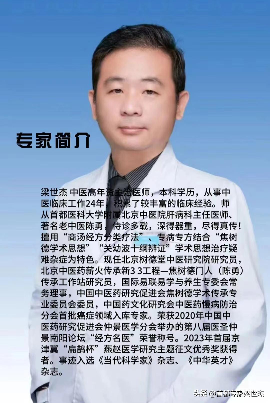 專家簡介:梁世傑 中醫高年資主治醫師,本科學歷,從事中醫臨牀工作24年,積累了較豐富的臨牀經驗。師從首都醫科大學附屬北京中醫院肝病科主任醫師、著名老中醫陳勇,侍診多載,深得器重,盡得真傳!擅用“商湯經方分類療法”、專病專方結合“焦樹德學術思想”“關幼波十綱辨證”學術思想治療疑難雜症爲特色。現任北京樹德堂中醫研究院研究員,北京中醫藥薪火傳承新3+3工程—焦樹德門人(陳勇)傳承工作站研究員,國際易聯易學與養生專委會常務理事,中國中醫藥研究促進會焦樹德學術傳承專業委員會委員,中國藥文化研究會中醫藥慢病防治分會首批癌症領域入庫專家。榮獲2020年中國中醫藥研究促進會仲景醫學分會舉辦的第八屆醫聖仲景南陽論壇“經方名醫”榮譽稱號。2023年首屆京津冀“扁鵲杯”燕趙醫學研究主題徵文優秀獎獲得者。事蹟入選《當代科學家》雜誌、《中華英才》雜誌。