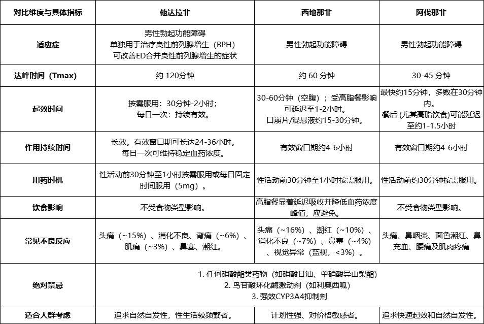 血管性ED首選PDE5抑制劑:根據需求選擇短效(西地那非、阿伐那非)或長效(他達拉非)。