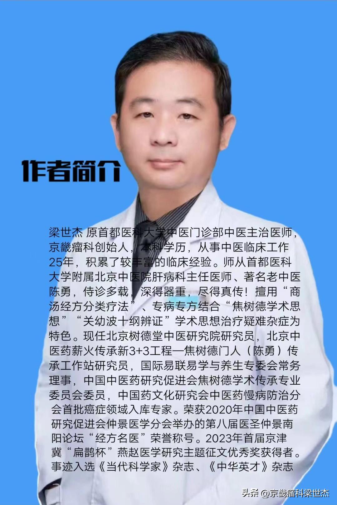 作者簡介:梁世傑 原首都醫科大學中醫門診部中醫主治醫師,京畿瘤科創始人,本科學歷,從事中醫臨牀工作25年,積累了較豐富的臨牀經驗。師從首都醫科大學附屬北京中醫院肝病科主任醫師、著名老中醫陳勇,侍診多載,深得器重,盡得真傳!擅用“商湯經方分類療法”、專病專方結合“焦樹德學術思想”“關幼波十綱辨證”學術思想治療疑難雜症爲特色。現任北京樹德堂中醫研究院研究員,北京中醫藥薪火傳承新3+3工程—焦樹德門人(陳勇)傳承工作站研究員,國際易聯易學與養生專委會常務理事,中國中醫藥研究促進會焦樹德學術傳承專業委員會委員,中國藥文化研究會中醫藥慢病防治分會首批癌症領域入庫專家。榮獲2020年中國中醫藥研究促進會仲景醫學分會舉辦的第八屆醫聖仲景南陽論壇“經方名醫”榮譽稱號。2023年首屆京津冀“扁鵲杯”燕趙醫學研究主題徵文優秀獎獲得者。事蹟入選《當代科學家》雜誌、《中華英才》雜誌。
