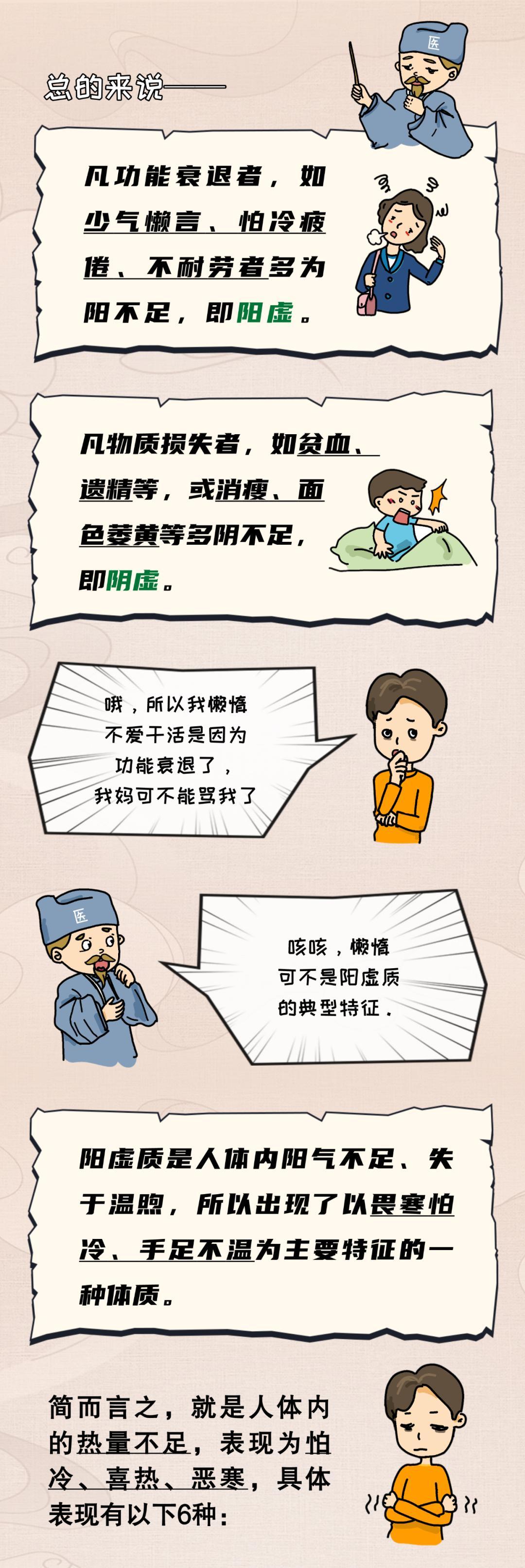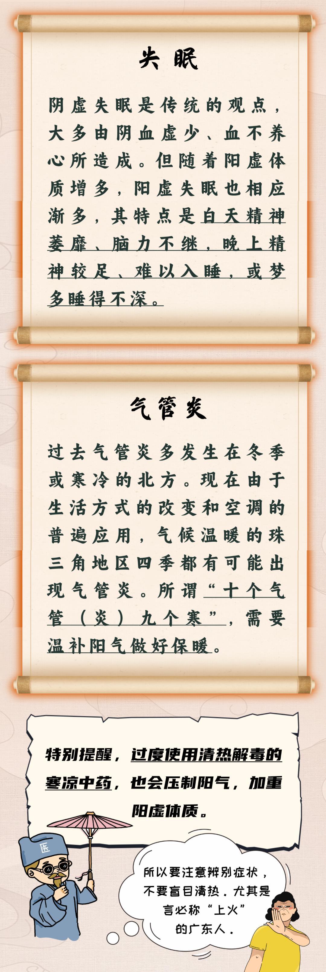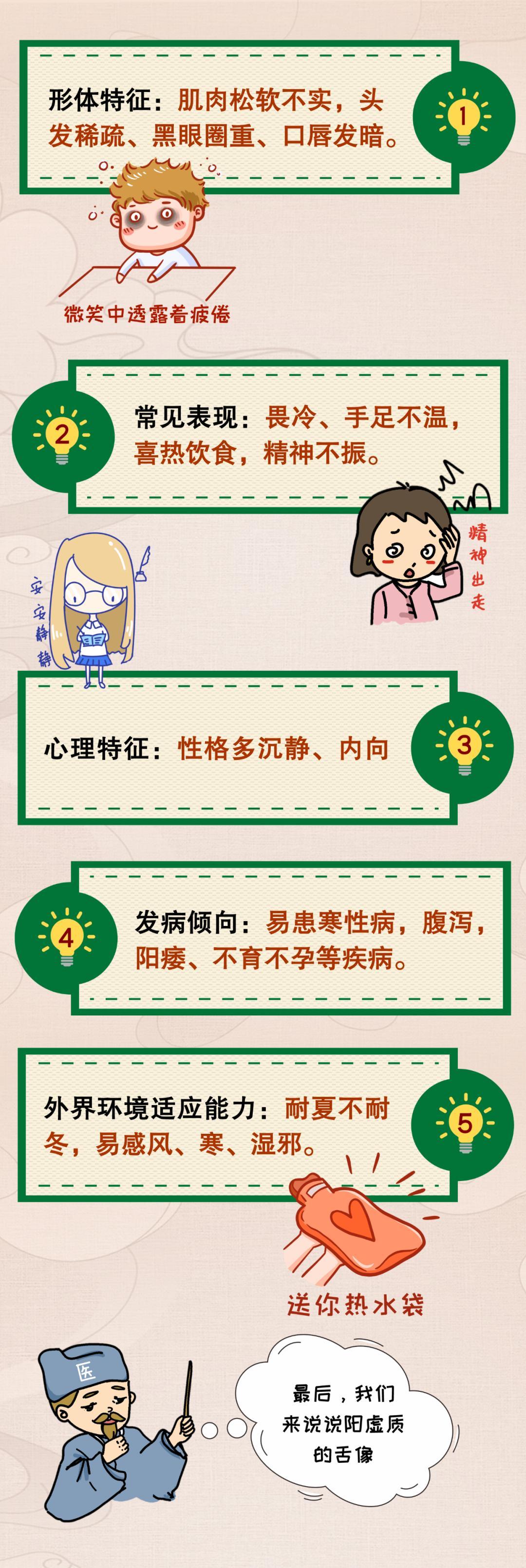 陽虛質由於機體陽氣不足,失於溫煦,故在日常起居中要注意避寒取暖,養護陽氣。特別是冬季適當多穿衣服,儘量喫溫熱的食物,尤其要注意背部、腰部和下肢的保暖。即使是夏天,在空調房也要注意上述幾個部位的保暖。