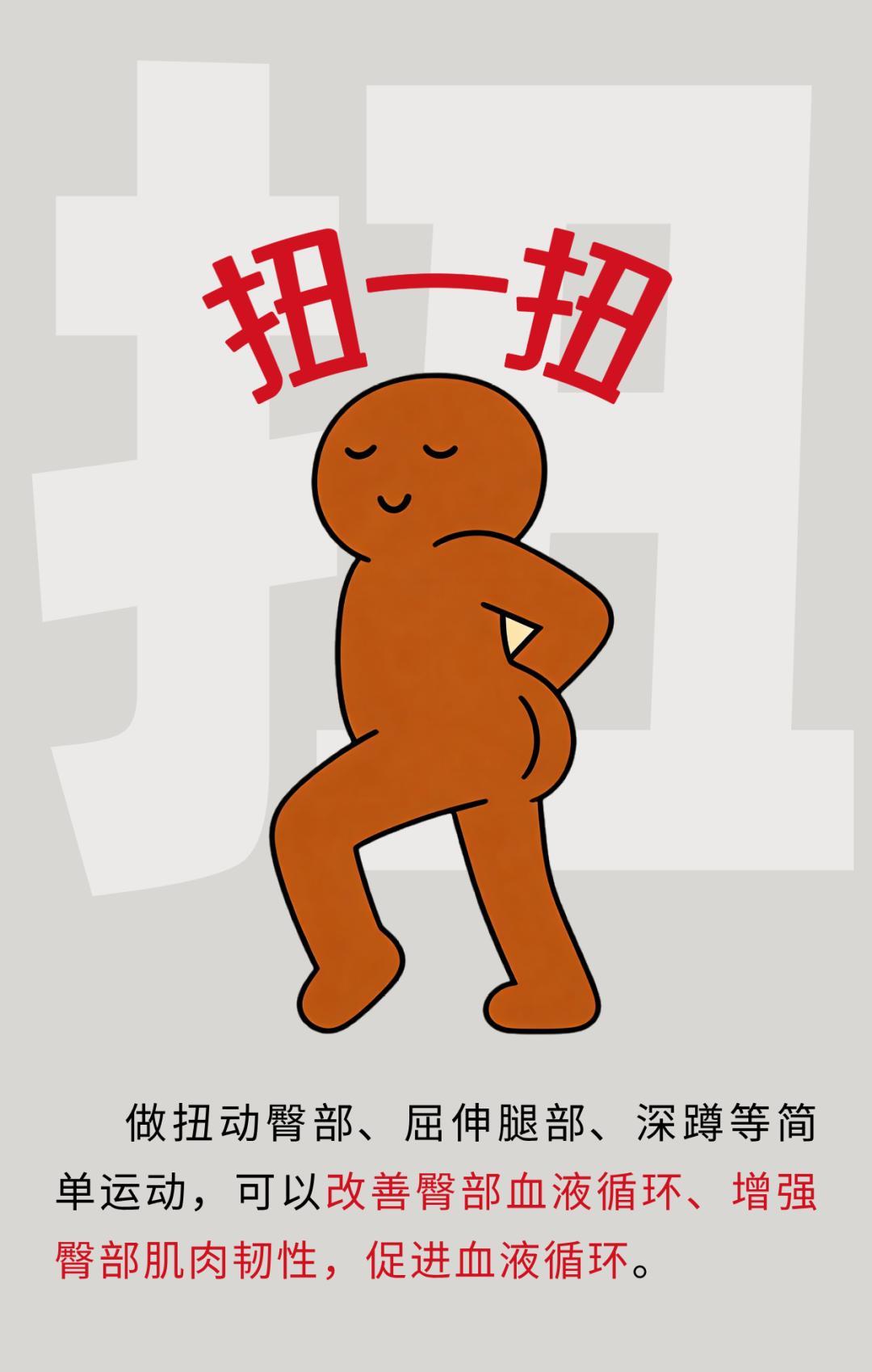 早晨起牀後,做扭動臀部、屈伸腿部、深蹲等簡單運動。
