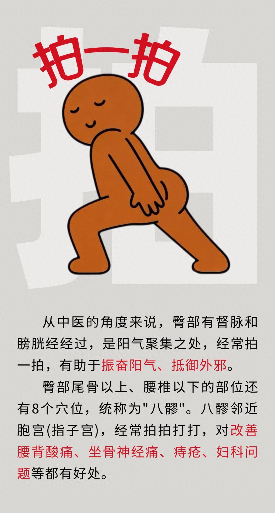每天堅持拍打臀上部5~I0分鐘,可幫助疏通經絡,緩解經絡瘀堵引起的婦科問題。