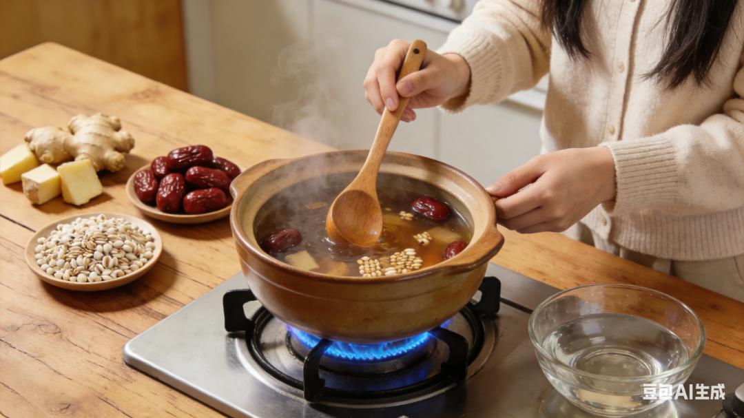溫脾代茶飲:用生薑3片,大棗3顆,炒薏苡仁10克,加水煮15分鐘代茶飲。