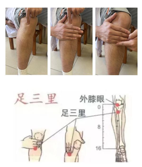足三里:在小腿外側,犢鼻下3寸,犢鼻與解溪連線上。按揉本穴具有健脾和胃、補中益氣之功,通過調理脾胃功能可助陽氣生化。