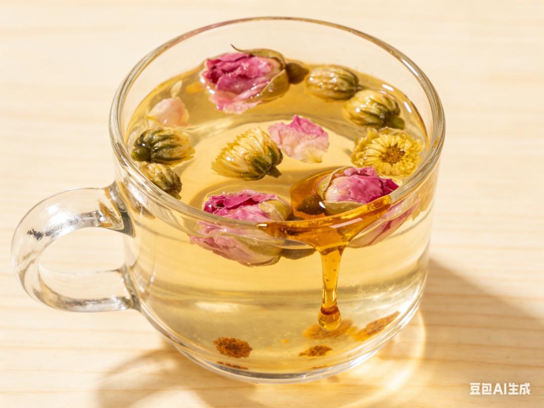 將玳玳花、玫瑰花投入玻璃杯中,用開水沖泡,靜待5分鐘左右,加入適量蜂蜜調味,即可品飲。