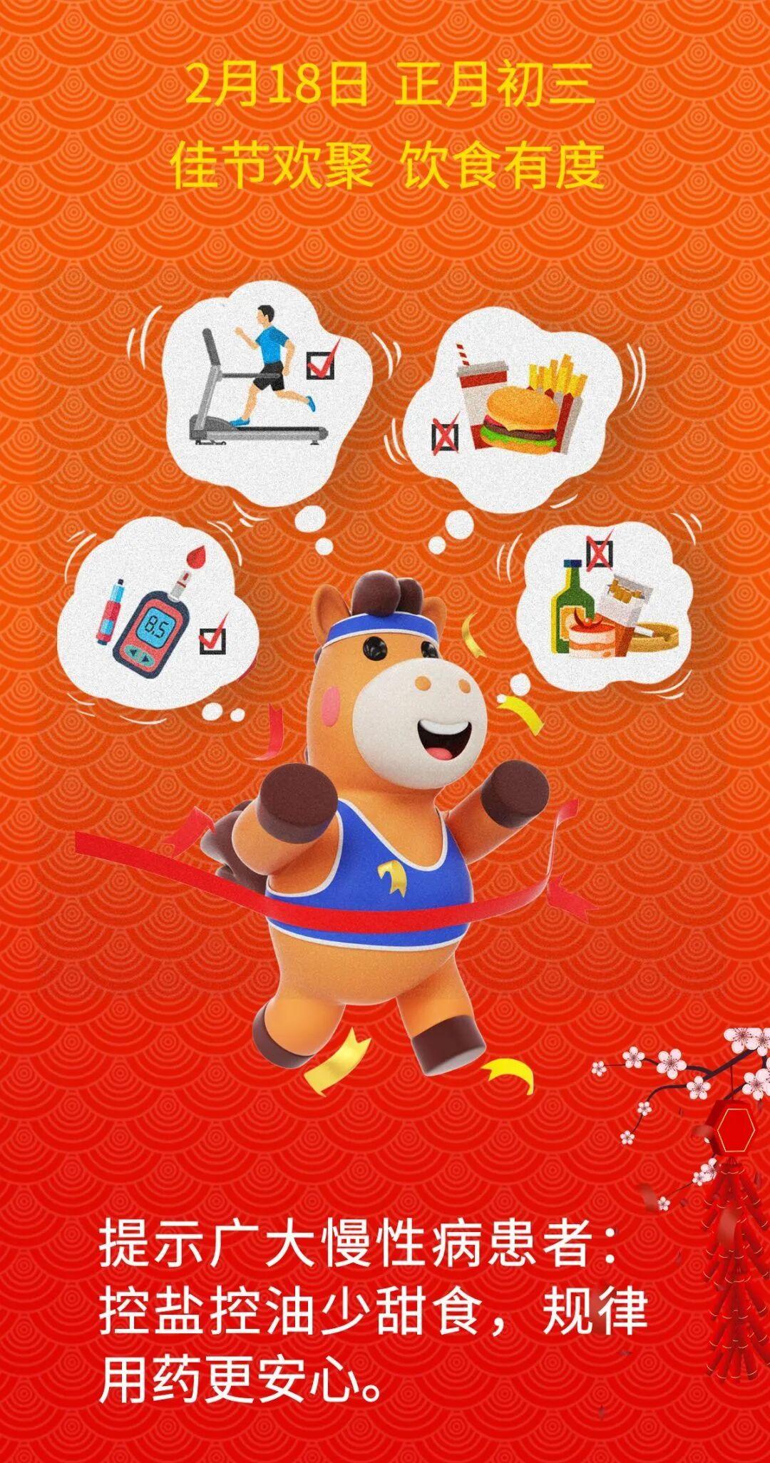 佳節歡聚,飲食有方。高血壓、高血糖人羣控鹽控油、規律進餐。少甜少酒少油膩,避免暴飲暴食誘發胰腺炎。規律用藥不中斷,平安健康過春節。