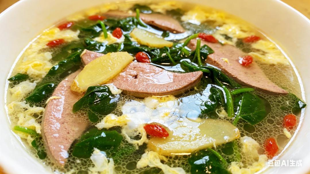 做法:豬肝切片醃漬,水沸後下薑片、豬肝,變色後入枸杞葉,淋蛋液成羹。