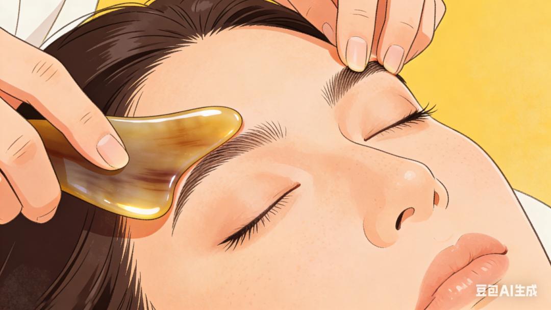 清潔眼周皮膚,塗抹少量精油或潤膚霜潤滑。用刮痧板沿眼眶輕柔刮拭,順序爲上眼眶、下眼眶。力度輕柔,每側刮拭10~15次,至皮膚微紅髮熱即可。能疏通眼周經絡,促進氣血運行,緩解視疲勞和乾澀不適。
