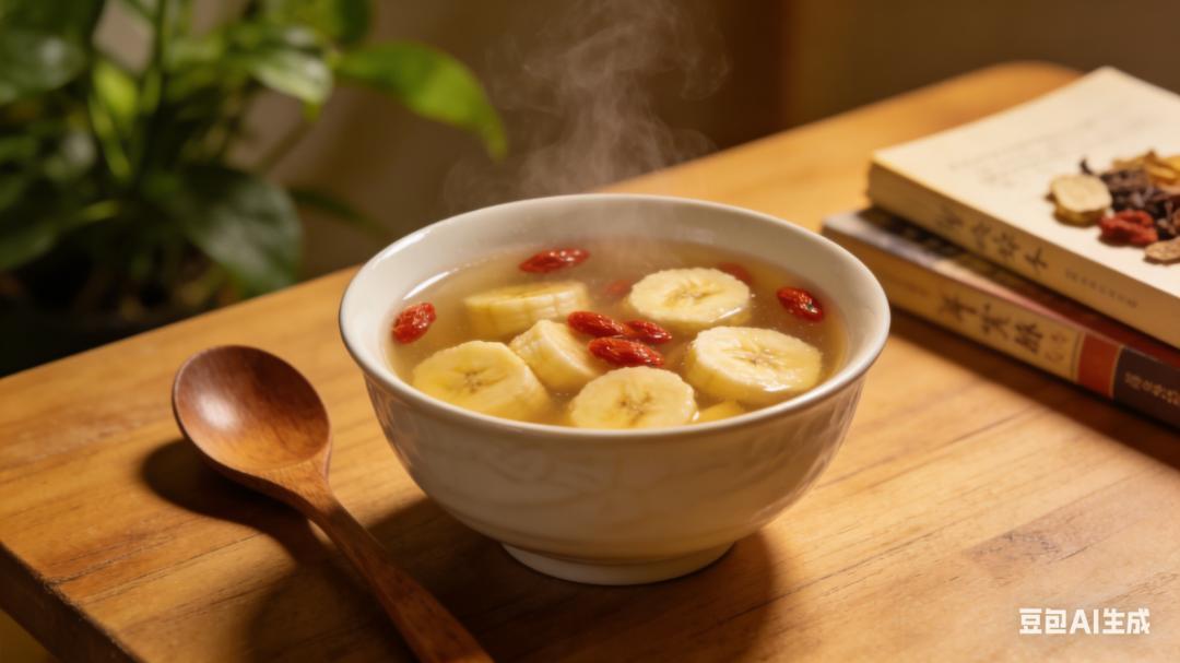 做法:香蕉去皮切成薄片,與枸杞一同下鍋,煮開後轉小火煮10分鐘,根據口味加入適量冰糖即可。