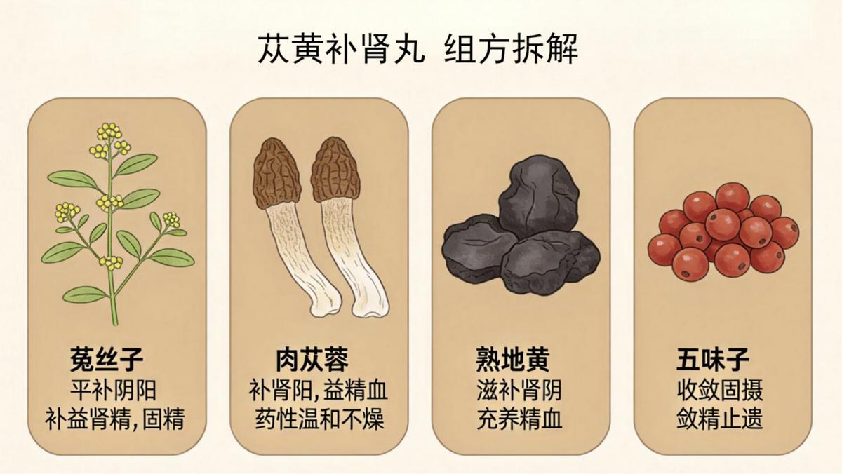 以蓯黃補腎丸爲例,其組成主要包括菟絲子、肉蓯蓉、熟地黃、五味子(酒蒸)。菟絲子平補陰陽,既能補益腎精,又具有固精作用;肉蓯蓉補腎陽、益精血,藥性溫和;熟地黃滋補腎陰,充養精血;五味子則具有收斂固攝的特點,可澀精止遺。