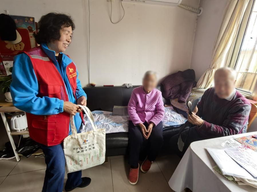 志願者郭阿姨入戶走訪居民,瞭解健康需求、發放護腰帶