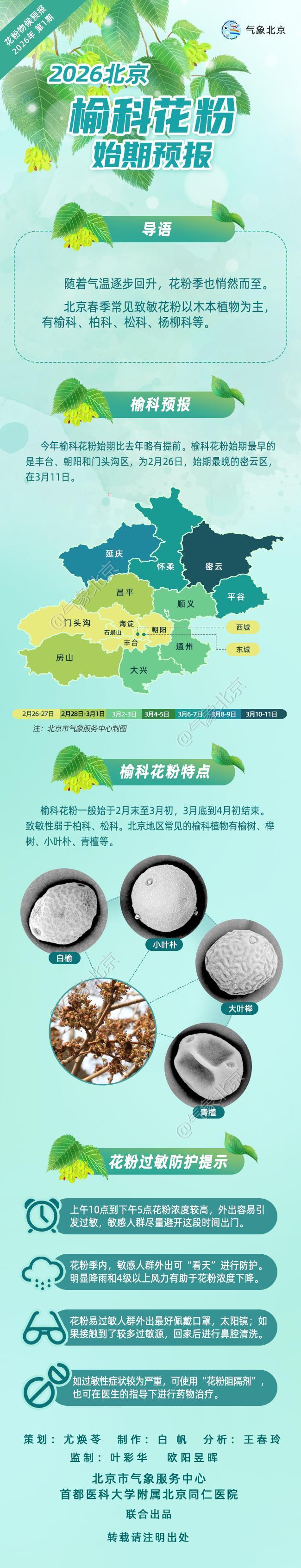 目前,北京市氣象服務中心已經開始發佈“2026年北京榆科花粉始期預報”,市民可以密切關注氣象部門每天發佈的花粉濃度監測信息,做好防護、積極治療。