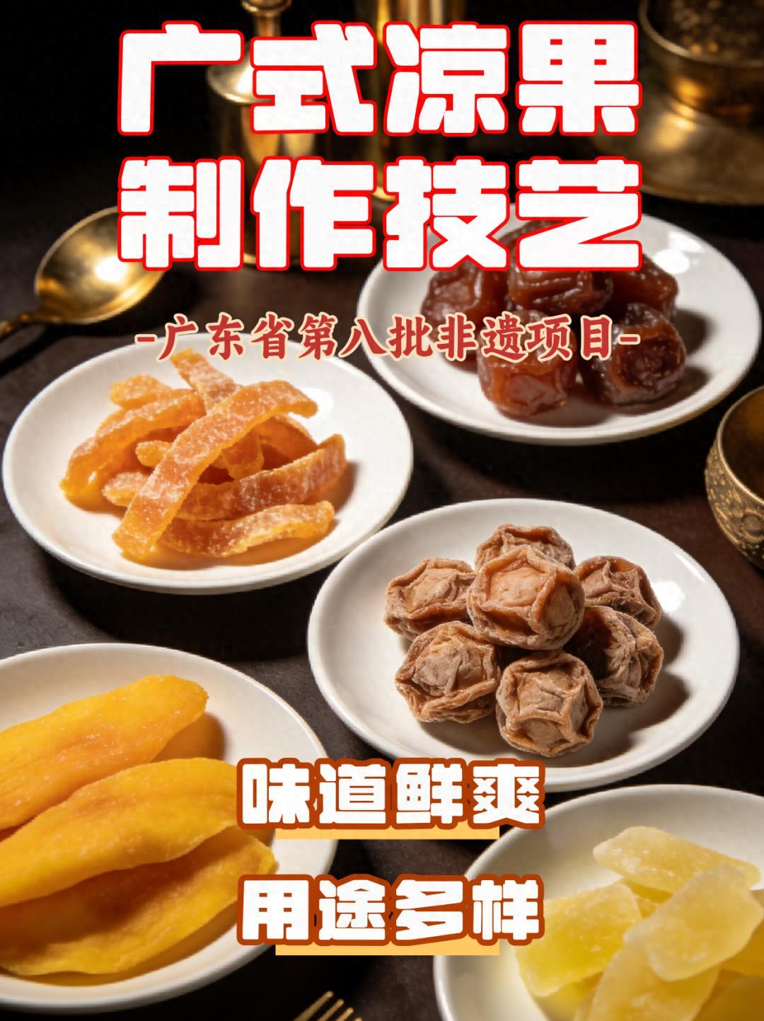 涼果是以瓜果爲原料,經醃製、糖漬、乾燥製成的傳統食品,起源於唐宋時期。廣式涼果製作包含乾製與溼制工藝,潮州庵埠鎮早在1937年已有涼果作坊,產品涵蓋話梅、陳皮梅等百餘種,輔料多用甘草及香料,部分品種兼具藥用價值。廣式涼果製作技藝2022年被列入廣東省省級非物質文化遺產名錄。