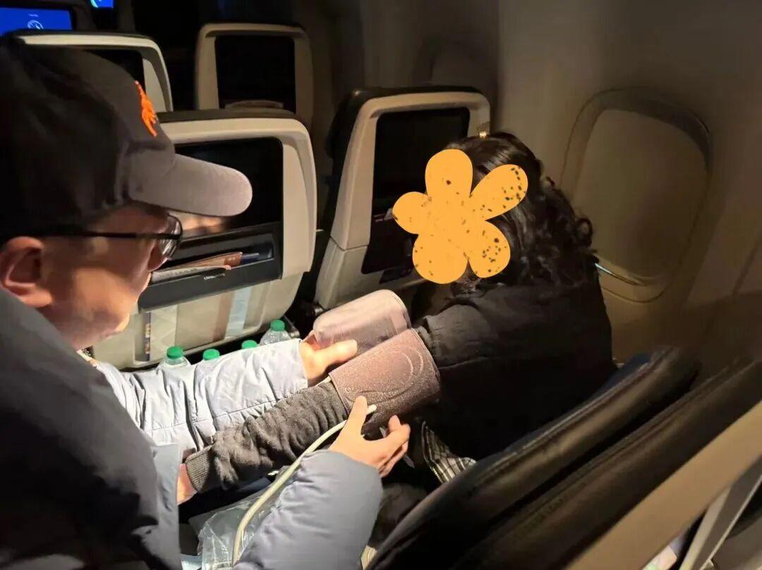 乘務員迅速通過廣播緊急尋找醫護人員。危急時刻, 一位男乘客匆匆趕來到圖女士所處的位置,“我是北京安貞醫院急診危重症中心的醫生……”楊賡醫生第一時間詢問了圖女士的既往病史,並在空間狹小的機艙環境中,通過按壓幫助她定位痛點,耐心詢問感受,並用血壓計爲圖女士測量血壓。通過對其疼痛部位、程度以及雙側血壓情況的分析,楊賡首先排除了圖女士患有主動脈夾層的可能性,他判斷圖女士很可能是急性腎結石發作引起的疼痛。