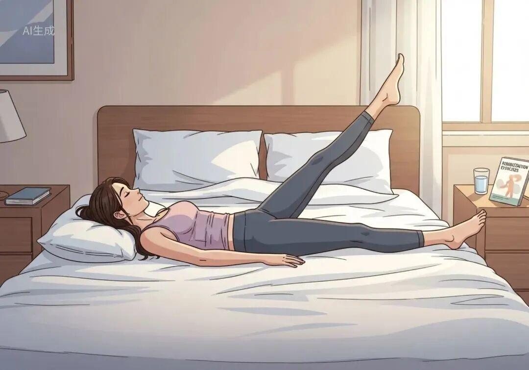 進入恢復期後,您可以嘗試一個特別有效又安全的動作——“直腿抬高”。躺在牀上就能做,它被譽爲強化 “天然護膝”(股四頭肌) 的黃金動作:平躺在牀上,雙腿繃直,緩慢將一側腿抬高至45度左右,保持5秒後緩慢放下,每組10~15次,每天做3~4組。