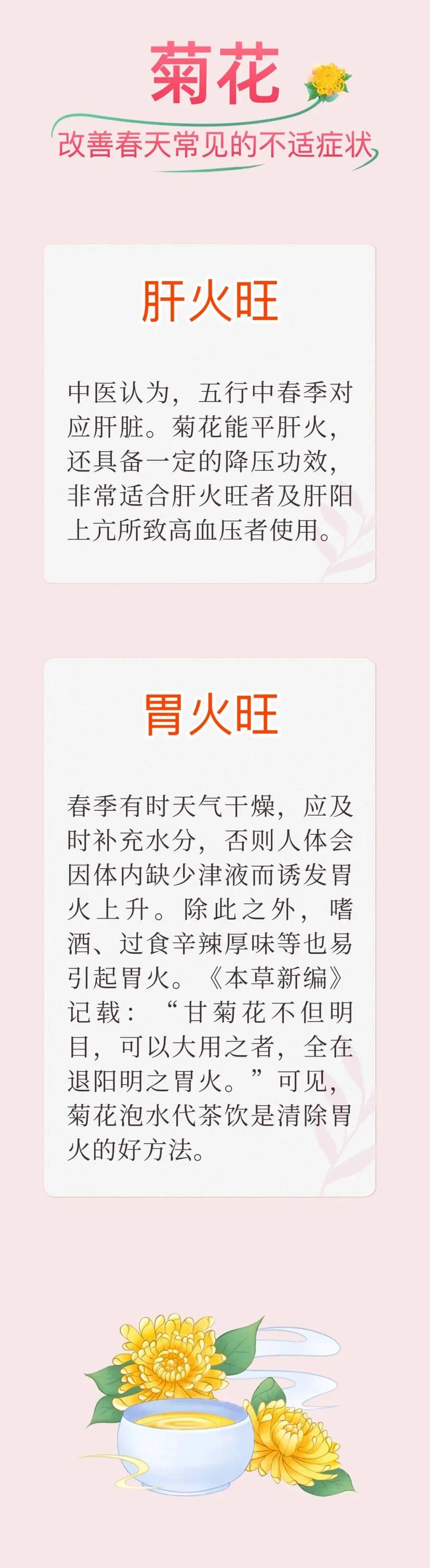 菊花茶,是我們平時最常飲用的花茶之一。菊花味苦、甘,性微寒,歸肺、肝經,有散風清熱、平肝明目、清熱解毒的作用。春季正是適合飲用菊花茶的時候,下面就講講菊花茶能改善哪些春天常見的不適症狀。