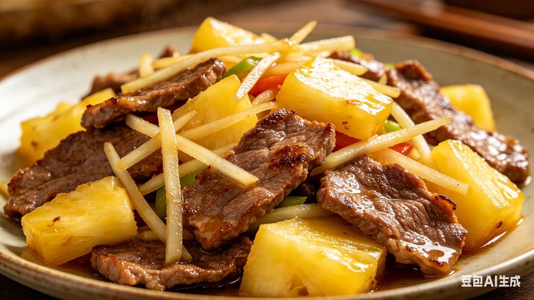 3.鐵鍋燒熱,放油,爆炒菠蘿和子姜,加糖少許,再放牛肉一起炒熟即可。
