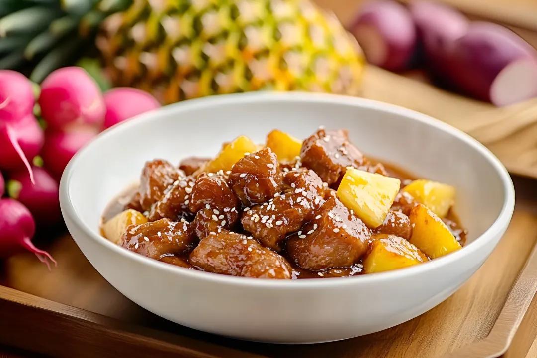 4.加入鳳梨塊,再燜10分鐘;收汁調味即可。